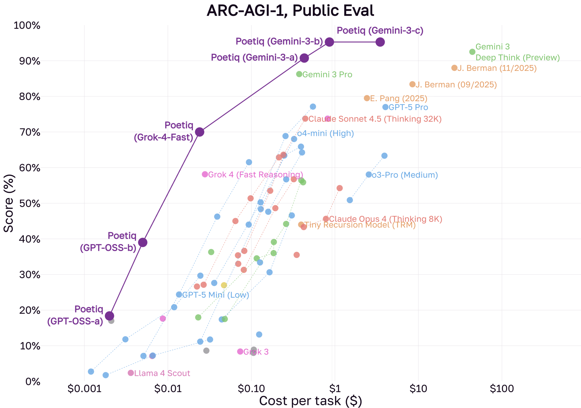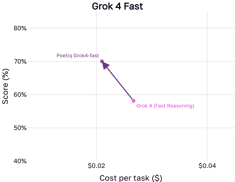 - Poetiq (Grok-4-Fast) emphasizes cost and is built on top of the Grok 4 Fast Reasoning