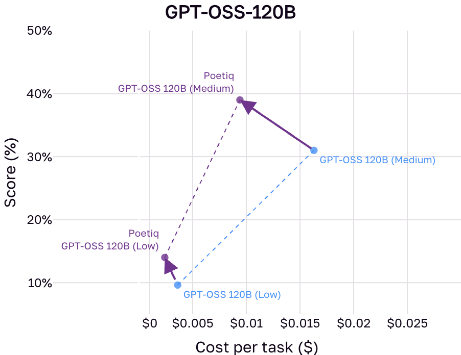 - Poetiq (GPT-OSS-b) is built on top of the open weights GPT-OSS-120B model and shows
