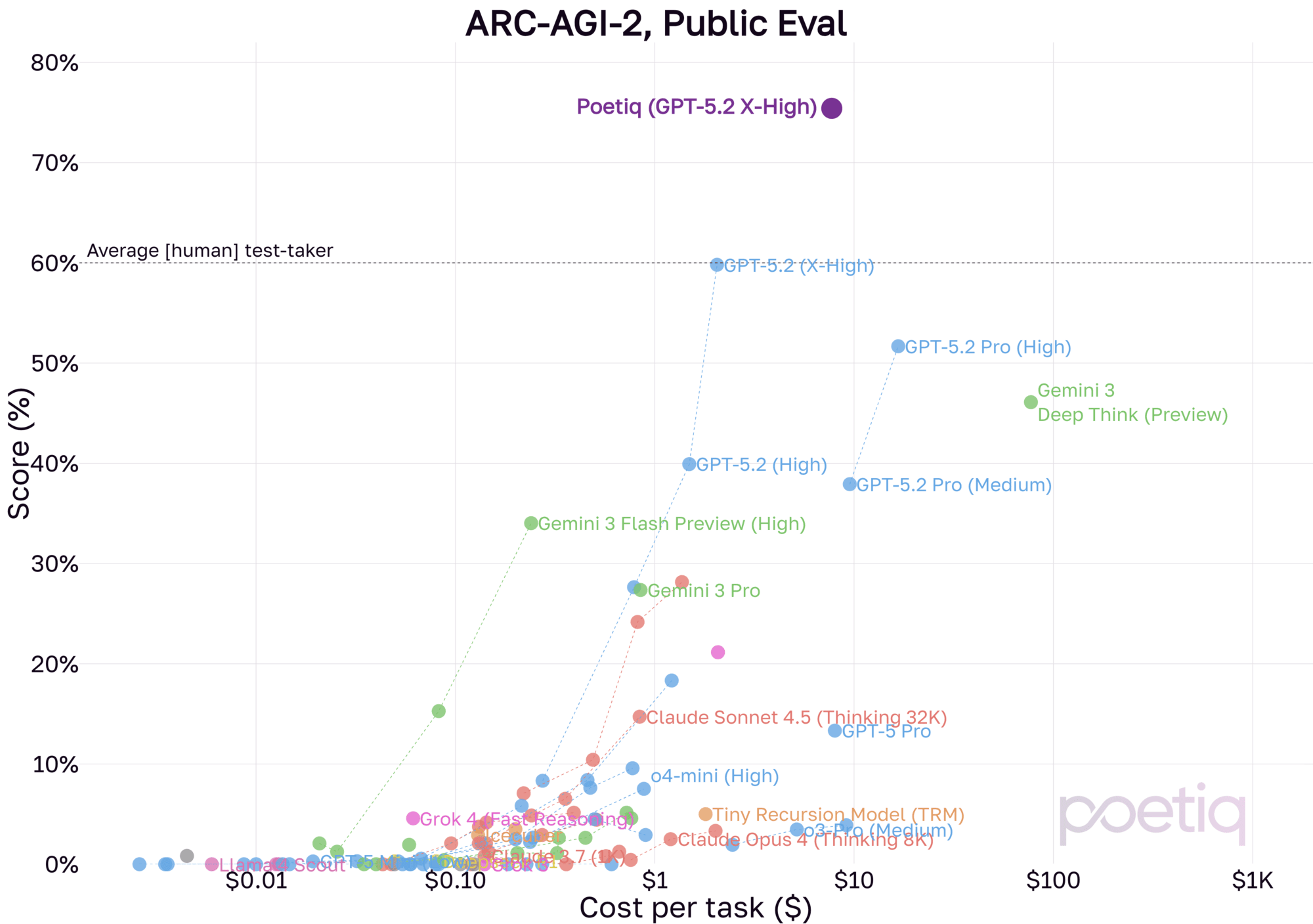 Using the same Poetiq harness as before, we saw results as high as 75% at under $8 / problem using GPT-5.2 X-High on the full PUBLIC-EVAL dataset. This beats the previous SOTA by ~15 percentage points.